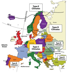 A: b) Mediterranean, c) Continental, d) Tundra, e) Alpine maritime |