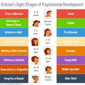 | EGO IDENTITY VERSUS ROLE CONFUSION | "Erikson's psychosocial stage of adolescence in which one faces the task of developing a self-image." (P. 142) |