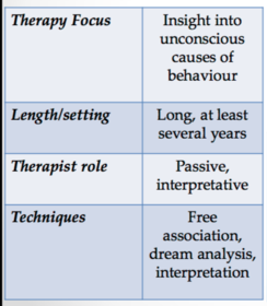 | Describe the basic principles (in terms of focus, length/setting, therapist role, and techniques) of psychoanalytic therapy? (LO1) | |