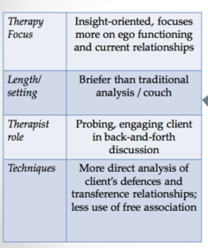 | Describe the basic principles (in terms of focus, length/setting, therapist role, and techniques) of psychodynamic therapy? (LO1) | |