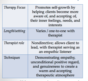 | Describe the basic principles (in terms of focus, length/setting, therapist role, and techniques) of person centred or humanistic therapy? (LO1) | |