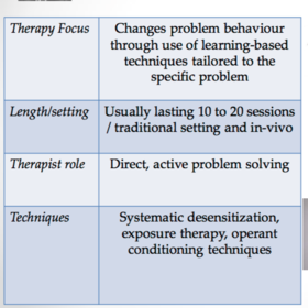 | Describe the basic principles (in terms of focus, length/setting, therapist role, and techniques) of behavioural therapy? (LO1) | |