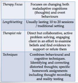 | Describe the focus of a cognitive/cognitive behavioural approach (CBT)? | The most prominent therapeutic model The fundamental assumption and focus of CBT and CT is that psychological distress is best understood and resolved by addressing the cognitions (thoughts, meanings, and beliefs) the person has about themselves and their difficulties. These cognitions are seen to have a reciprocal relationship with behaviour and emotion and many psychological difficulties are viewed to have developed due maladaptive or negative patterns developing, sometimes through behavioural mechanism, between cognition, behaviour and emotion. Therefore, a cognitive approach aims to address psychological difficulties by attempting to change these patterns. |
