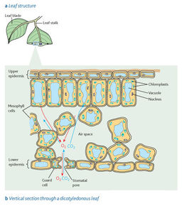| Adaptation of a leaf for gas exchange | No living cell is far from the external air, and therefore a source of oxygen and carbon dioxide. Diffusion takes place in the gas phase (air), which makes it more rapid than if it were in water. There is a short, fast diffusion pathway. The plant leaf has a very large surface area compared with the volume of living tissue. Diffusion gradients are maintained by the mitochondria carrying out respiration and chloroplasts carrying out photosynthesis. |