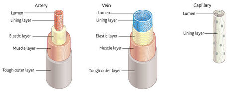 | Basic structure of blood vessles | Tough outer layer that resists pressure changes from both within and outside. Muscle layer than can contract and so control the flow of blood. Elastic layer that helps to maintain blood pressure by stretching and springing back. Thin inner lining (endothelium) that is smooth to prevent friction and thin to allow diffusion. Lumen - the central cavity of the blood vessel through which the blood flows |