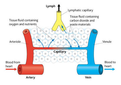 | Return of tissue fluid to the circulatory system via capillaries | Most tissue fluid returns to the blood plasma via the capillaries. The loss of tissue fluid from the capillaries reduces the hydrostatic pressure inside them. As a result by the time the blood has reached the venous end of the capillary network its hydrostatic pressure is less than that out the tissue fluid outside it. Therefore tissue fluid is forced back into the capillaries by the higher hydrostatic pressure outside them. In addition, the osmotic forces resulting from the proteins in the blood plasma pull water back into the capillaries. The tissue fluid has lost much of its oxygen and nutrients by diffusion into the cells that it bathed, but it has gained carbon dioxide and waste materials in return. |