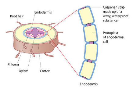 | The casparian strip | When water reaches the endodermis by the apoplastic pathway, the waterproof band that makes up the Casparian strip in endodermal cells prevents it progressing further along the cell wall. At this point, water is forced into the living protoplast of the cell, where it joins water that has arrived there by the symplastic pathway. |
