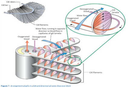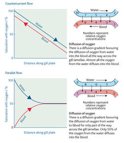 | Countercurrent flow | The flow of water in the gill lamellae and the flow of blood within them are in opposite directions. This is important for ensuring that the maximum possible gas exchange is achieved. If the water and blood flow in the same direction, far less gas exchange would take place. |