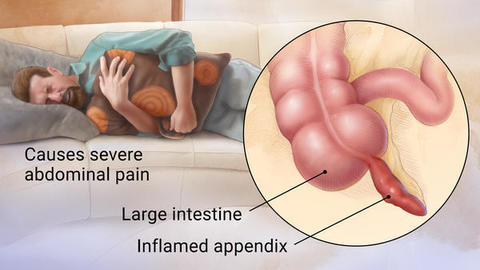 Appendicitis | Appendicitis is inflammation of theappendix, which is a thin pouch attached to the large intestine onthe right side of the abdomen. It is usually about the size of a finger. |