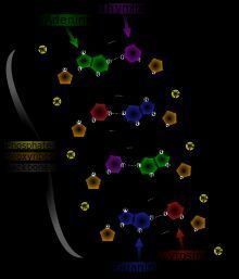 MOLECULAR BASIS FOR INHERITANCE 1.DNA and chromosomes 2.Reproduction 3. Recombination and genetic linkage | The molecular basis for genes isdeoxyribonucleic acid (DNA). DNA is composed of a chain of nucleotides, of which there are four types: adenine (A), cytosine (C),guanine (G), and thymine (T). Genetic information exists in the sequence of these nucleotides, and genes exist as stretches of sequence along the DNA chain.[46] Virusesare the only exception to this rule—sometimes viruses use the very similar molecule RNA instead of DNA as their genetic material. |