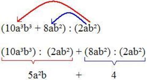 | (10a3b3 + 8ab2) : (2ab2) | O dividendo 10a3b3 + 8ab2 é formado por dois monômios. Dessa forma, o divisor 2ab2, que é um monômio, irá dividir cada um deles, veja: (10a3b3 + 8ab2) : (2ab2) |