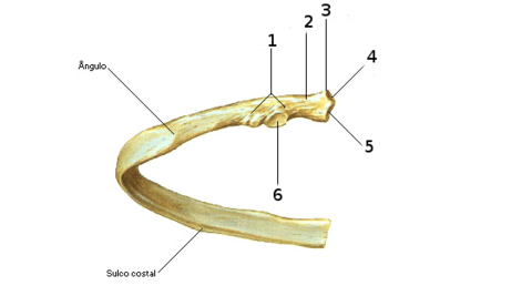 | 1 - Tubérculo; 2 - Coto; 3 - Cabeça; 4 - Faceta articular superior para o corpo vertebral; 5 - Faceta articular inferior para o corpo vertebral; 6 - Faceta articular para o processo transverso | |