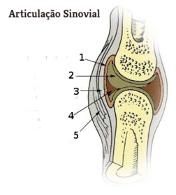 | 1 - Membrana sinovial 2 - Cartilagem 3 - Cápsula articular 4 - Líquido sinovial 5 - Ligamento | |