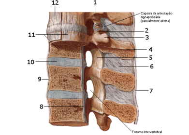 | 1 - Processo articular inferior 2 - Processo articular superior 3 - Processo transverso 4 - Processo espinhoso 5 - Ligamento flavum 6 - Ligamento inter-espinhoso 7 - Ligamento supra-espinhoso 8 - Ligamento longitudinal posterior 9 e 12 - Ligamento longitudinal anterior 0 - Disco intervertebral 11 - Corpo vertebral | |