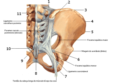 | 1 - Ligamento ílio-lombar 2 - Espinha ilíaca póstero-superior 3 - Crista ilíaca 4 - Tubérculo da crista ilíaca 5 - Espinha ilíaca ântero-superior 6 - Ligamento sacro-espinhoso 7 - Ligamento sacro-tuberoso 8 e 9 - Ligamento sacrococcígeo posterior 10 - Ligamento sacrococcígeo lateral 11 - Ligamento supra-espinhoso | |