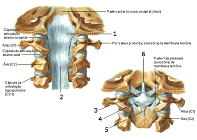 | 1 - Membrana tectória 2 - Ligamento longitudinal posterior 3 - Ligamento longitudinal occipital 4 - Ligamento transverso do Atlas 5 - Ligamento longitudinal axoideu 6 - Ligamentos alares | |