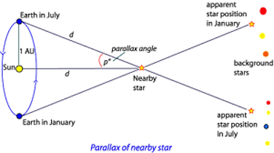 LOOKING INTO SPACE Parallax and Distance to a Star | Astronomers take pictures of the sky 6 months apart (when the Earth is on opposite sides of its orbit). The apparent movement of a star, between the 2 photos lets you work out the distance to the star. The bigger the movement, the closer the star. |