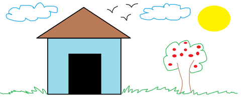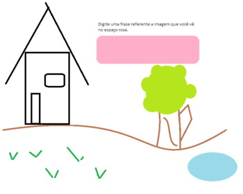 Faça uma releitura da imagem ao lado no PAINT. Veja no verso do cartão as ferramentas usadas. | FERRAMENTAS USADAS 1. Linha; Telhado da Casa 2. Retângulo: Casa 3. Curva: Chão ou piso, Tronco da árvore 4. Círculo: Lago, Árvore, e Folhas |