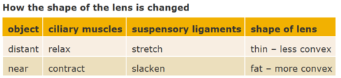 | State the function of the ciliary muscle | attached to the lens by suspensory ligaments. the muscles change the thickness of the eye lens |