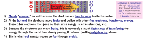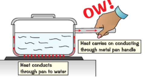 | CONDUCTION OF HEAT IS THE PROCESS WHERE VIBRATING PARTICLES PASS ON THEIR EXTRA KINETIC ENERGY TO NEIGHBORING PARTICLES. | |
