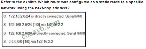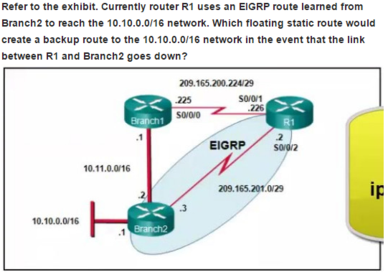 | -ip route 10.10.0.0 255.255.0.0 Serial 00/0 100 -ip route 10.10.0.0 255.255.0.0 209.165.200.226 100 | ip route 10.10.0.0 255.255.0.0 209.165.200.226 100 |