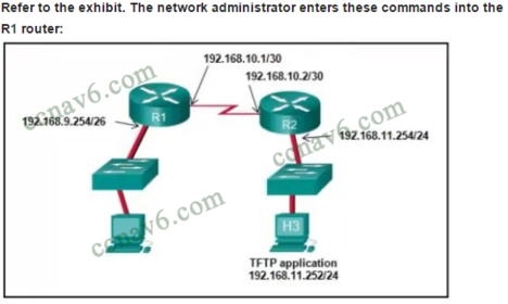 | R1# copy running-config tftp Address or name of remote host [ ]? When the router prompts for an address or remote host name, what IP address should the administrator enter at the prompt? 192.168.10.2 192.168.11.252 192.168.11.254 192.168.9.254 192.168.10.1 | 192.168.11.252 |