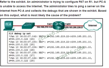 | -The inside and outside NAT interlaces have been configured backwards -The inside global address is not on the same subnet as the ISP -The address on Fa0/0 should be 64.100.0.1. -The NAT source access list matches the wrong address range. | The inside global address is not on the same subnet as the ISP |