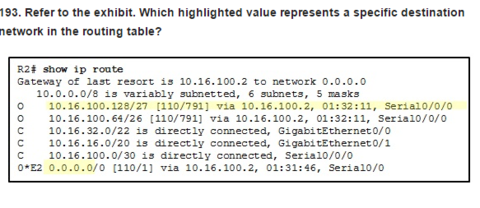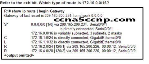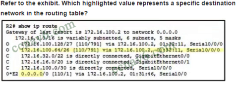 | A network administrator reviews the routing table on the router and sees a route to the destination network 172.16.64.0/18 with a next-hop IP address of 192.168.1.1. What are two descriptions of this route? (Choose two.) -parent route -default route -level 2 child route -ultimate route -supernet route | -level 2 child route -ultimate route |