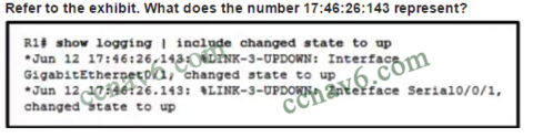 | The time passed since the syslog server has been started the time when the syslog message was issued the time on the router when the show logging command was issued the time pass since the interfaces have been up | the time when the syslog message was issued |