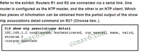 | -Both routers are configured to use NTPv2. -Router R2 is the master, and R1 is the client. -The IP address of R1 is 192. 168. 1. 2. -The IP address of R2 is 192. 168. 1. 2. | Router R1 is the master, and R2 is the client. The IP address of R2 is 192. 168. 1. 2. |