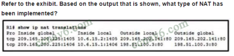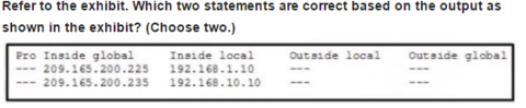 | -The host with the address 209.165.200.235 will respond to requests by using a source address of 209.165.200.235 -The output is the result of the show ip nat translations command -Traffic with the destination address of a public web server will be sourced from the IP of 192.168.1.10. -The host with the address 209.165.200.235 will respond to requests by using a source address of 192.168.10.10. -The output is the result of the show ip nat statistics command | The output is the result of the show ip nat translations command |