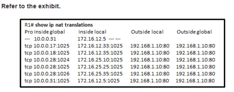 | A company has an internal network of 172.16.25.0/24 for their employee workstations and a DMZ network of 172.16.12.0/24 to host servers. The company uses NAT when inside hosts connect to outside network. A network administrator issues the show ip nat translations command to check the NAT configurations. Which one of source IPv4 addresses is translated by R1 with PAT? 10.0.0.31 172.16.12.5 172.16.12.33 192.168.1.10 172.16.25.35 | 172.16.25.35 |