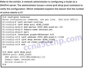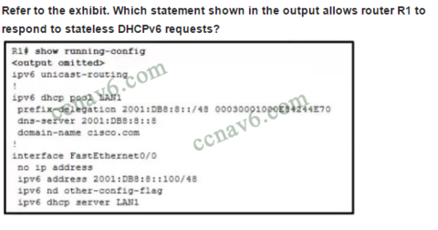 | A network administrator configures a router to provide stateful DHCPv6 operation. However, users report that workstations do not receive IPv6 addresses within the scope. Which configuration command should be checked to ensure that statefull DHCPv6 is implemented? -The dns-server line is included in the ipv6 dhcp pool section. -The ipv6 nd managed-config-flag is entered for the interface facing the LAN segment. -The ipv6 nd other-config-flag is entered for the interface facing the LAN segment. -The domain-name line is included in the ipv6 dhcp pool section. | The dns-server line is included in the ipv6 dhcp pool section. |