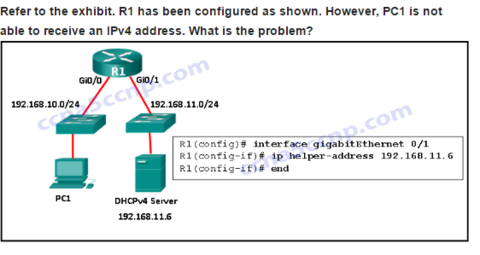 | -A DHCP server must be installed on the same LAN as the host that is receiving the IP address. -R1 is not configured as a DHCPv4 server. -The ip address dhcp command was not issued on the interface Gi0/1. -The ip helper-address command was applied on the wrong interface. | The ip helper-address command was applied on the wrong interface. |
