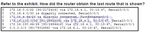 | Which statement describes a route that has been learned dynamically? -It is automatically updated and maintained by routing protocols. -It is unaffected by changes in the topology of the network. -It has an administrative distance of 1. -It is identified by the prefix C in the routing table. | It is automatically updated and maintained by routing protocols. |