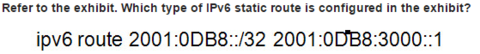 | What network prefix and prefix-length combination is used to create a default static route that will match any IPv6 destination? :/128 FFFF:/128 ::1/64 ::/0 | ::/0 |