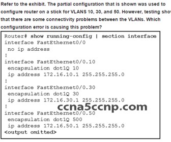 | -A configuration for the native VLAN is missing. -There is no IP address configured for the FastEthernet 0/0 interface. -The wrong VLAN has been configured on subinterface Fa0/0.50. -The VLAN IP addresses should belong to the same subnet. | The wrong VLAN has been configured on subinterface Fa0/0.50. |