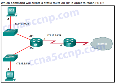 | -R2(config)# ip route 172.16.2.1 255.255.255.0 172.16.3.1 -R2(config)# ip route 172.16.2.0 255.255.255.0 172.16.2.254 -R2(config)# ip route 172.16.2.0 255.255.255.0 172.16.3.1 -R2(config)# ip route 172.16.3.0 255.255.255.0 172.16.2.254 | R2(config)# ip route 172.16.2.0 255.255.255.0 172.16.3.1 |