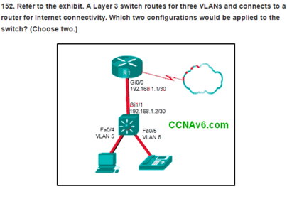 | -(config)# interface gigabitethernet 1/1 -(config-if)# no switchport -(config)# interface vlan 1 -(config-if)# ip address 192.168.1.2 255.255.255.0 -(config-if)# no shutdown -(config)# interface gigabitethernet1/1 -(config-if)# switchport mode trunk -(config)# interface fastethernet0/4 -(config-if)# switchport mode trunk -(config)# ip routing | -(config)# interface gigabitethernet 1/1 -(config-if)# no switchport -(config)# ip routing |