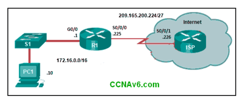 | 153. Refer to the exhibit. R1 was configured with the static route command ip route 209.165.200.224 255.255.255.224 S0/0/0 and consequently users on network 172.16.0.0/16 are unable to reach resources on the Internet. How should this static route be changed to allow user traffic from the LAN to reach the Internet? -Add an administrative distance of 254. -Change the destination network and mask to 0.0.0.0 0.0.0.0 -Change the exit interface to S0/0/1. -Add the next-hop neighbor address of 209.165.200.226. | Change the destination network and mask to 0.0.0.0 0.0.0.0 |