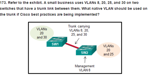| Which two characteristics describe the native VLAN? (Choose two.) -Designed to carry traffic that is generated by users, this type of VLAN is also known as the default VLAN. -The native VLAN traffic will be untagged across the trunk link. -This VLAN is necessary for remote management of a switch. -High priority traffic, such as voice traffic, uses the native VLAN. -The native VLAN provides a common identifier to both ends of a trunk. | -The native VLAN traffic will be untagged across the trunk link -The native VLAN provides a common identifier to both ends of a trunk |