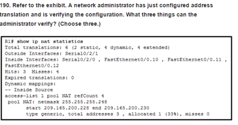 | -Address translation is working. -Three addresses from the NAT pool are being used by hosts. -The name of the NAT pool is refCount. -A standard access list numbered 1 was used as part of the configuration process. -Two types of NAT are enabled. -One port on the router is not participating in the address translation. | -Address translation is working. -A standard access list numbered 1 was used as part of the configuration process. -Two types of NAT are enabled. |
