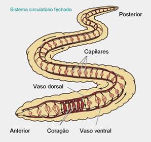 | Sistema circulatório Fechado, possuindo um vaso dorsal (principal) onde encontram-se corações laterais. O sangue consiste em plasma líquido, amebócitos incolores e anucleados e tem hemoglobina dissolvida no plasma (cor vermelha) | |