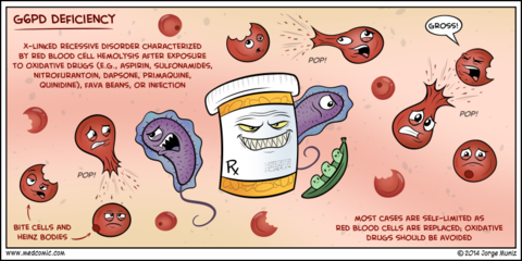 | Glucose-6-phosphate dehydrogenase deficiency: Pathophysiology: Clinical effects: Blood film results: | Glucose-6-phosphate dehydrogenase deficiency: Failure to produce normal amounts of NADPH, which is reduced to NADP to convert GSSG to GSH, which is an important antioxidant called glutathione. As a result Hb and cell membranes become cross linked. Haemolysis occurs because of oxidative damage to Hb and cell membrane. Provides resistance against malaria since the parasite needs NADPH for energy. Features of G6PD: Episodes of Haemolytic anaemia precipitate by illness, drugs and broad beans. Increased reticulocytes Blood film: Reticulocytes and Heinz bodies seen on blood film. They are a blue stained mass of oxidized, denatured and aggregated Hb attached to the inside of the RBC membrane. |