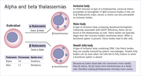 | Inherited haemolytic anaemia categories: | Inherited haemolytic anaemias: Cell membrane of cytoskeletal abnormalities Hereditary spherocytosis Enzymopathies Glucose-6-phosphate dehydrogenase deficiency Haemoglobinopathies Thalassaemia (in alpha thalassaemia excess beta chains cause membrane damage whereas in beta thalassaemia excess alpha chains cause membrane damage) Abnormal globin chain (HbS sickle cell anaemia) |
