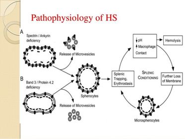 | Hereditary spherocytosis: Pathophysiology: Long term consequences: Treatment: | Hereditary spherocytosis: Due to autosomal dominant mutations of RBC cytoskeletal proteins e.g ankyrin, spectrin, band 3 or protein 4.2 Mutations in ankyrin, spectrin and protein 4.2 results in reduced density of the membrane skeleton, disrupting the stability of the overlying lipid layer releasing band 3 containing microvesicles. Defects of band 3 result in reduced band 3 and its lipid stabilizing effect resulting in microvesicles forming without band 3. In both instances, RBCs form with reduced surface to volume ratio and decreased deformability. As a result, splenic destruction of spherocytes occurs as they pass from the cords to the sinuses by macrophages. Anaemia ensues. Splenectomy may be necessary in some cases. With lifelong haemolytic anaemia, there is increased unconjugated bilirubin, which over time may precipitate forming pigment gallstones. |