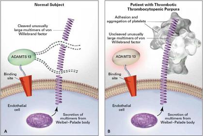 | Thrombotic thrombocytopenic purpura (TTP): Features: Pathophysiology: Mortality: Treatment: | Thrombotic thrombocytopenic purpura (TTP): Features; Neurological, fever, renal impairment, thrombocytopenia and fragmented RBCs. Pathophysiology: Due to a deficiency of ADAMTS13; an enzyme that normally cleaves large multimers of vWF (von willebrand factor). Endothelial cells synthesize vWF as large multimers which project from the endothelial cell into the bloodstream. Such an extensive multimer is cleaved by the ADAMTS13 enzyme into smaller multimers, with only a small multimer jutting out from the endothelial cell. A mutation in ADAMTS13 results in lack of cleavage of the large vWF multimer, and since this is projecting into the bloodstream, platelets become adhere, become activated and aggregate. Untreated mortality is high at 80%. Plasmapheresis reduces this to 20% by essentially using fresh frozen plasma to replace deficient ADAMTS13. |