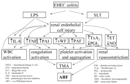 | Haemolytic uraemic syndrome (HUS): Main age group affected: Causative agent: Pathophysiology: Consequences: Treatment: | Haemolytic uraemic syndrome (HUS): Usually occurs in children >90% of cases are due to shiga toxin, produced by organisms such as E.coli 0157 Shiga toxin binds to Gb3 receptor on glomerular endothelium triggering a signalling cascade that either leads to apoptosis or leukocyte binding. The shiga toxin activated endothelial cells become thrombogenic through producing cytokines that activate platelets. In addition, shiga toxin inhibits ADAMTS13 enzyme, resulting in the formation of large multimers of vWF, resulting in platelet adhesion, activation and aggregation. Consequently, a microthrombus forms resulting in microangiopathic haemolysis, where the microthrombus moving through small vessels destroy RBCs, forming schistocytes or fragmented RBCs. Renal failure occurs due to toxicity to the renal endothelium; dialysis required Other organs are usually not involved >90% do not require plasmapheresis |