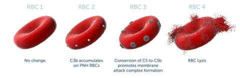 | Paroxysmal nocturnal haemoglobinuria: Pathophysiology: Patients suffer from: Treatment: | Paroxysmal nocturnal haemoglobinuria: Complement mediated haemolysis Individuals have an acquired deficiency of complement inhibitors on the surface or RBCs. As a result, there is the inability to stop membrane attack complex (MAC) formation on the surface of RBCs resulting in intravascular haemolysis, producing red/orange urine. E.g CD59 is required to stop C8 to C9 step of MAC formation. It is common for mutations to occur in GPI anchored proteins, especially complement inhibitors. In PNH, there is a mutation in PIGA gene in a cell, resulting in subsequent daughter cells through clonal expansion which also have the defect. This mutation means affected cells are unable to synthesis the anchor for GPI proteins, resulting in a deficiency in all GPI proteins. Patients suffer from thrombosis, anaemia (from haemolysis), smooth muscle dystonia (due to NO depletion) and overall impaired quality of life. Treatment: Eculizimab is a monoclonal antibody that binds to C5 and prevents cleavage by C5 convertase to C5a (anaphylatoxin) and C5b (triggers MAC formation). Costs $500,000 NZD. |