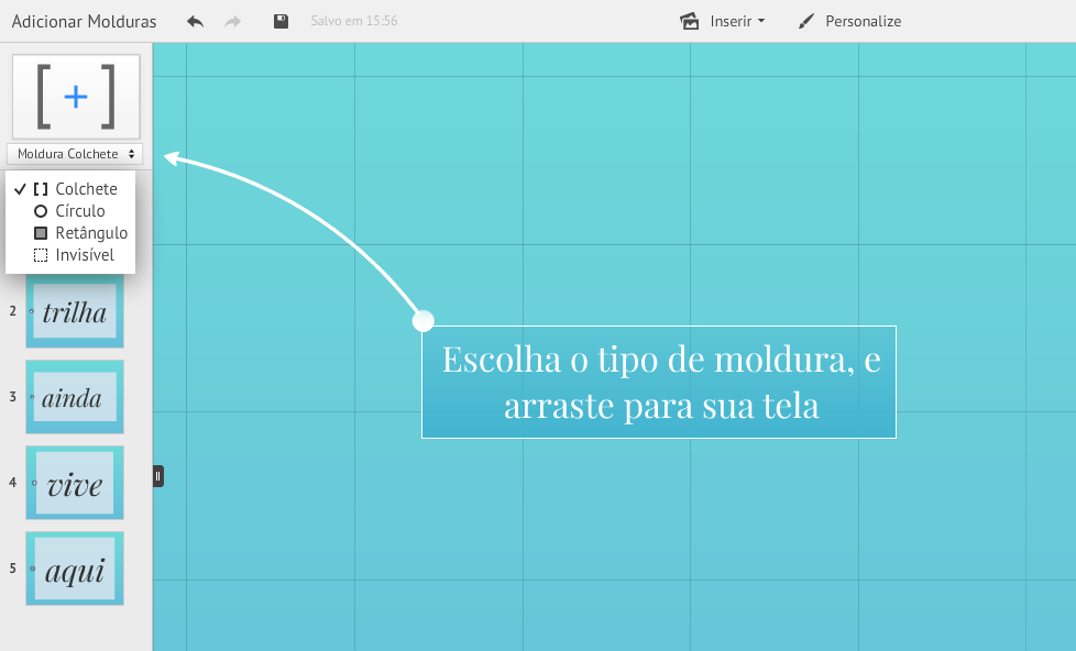 Selecione o tipo de moldura e arraste-o para a tela. Isso também irá adicionar automaticamente um novo ponto na trilha do Prezi. |